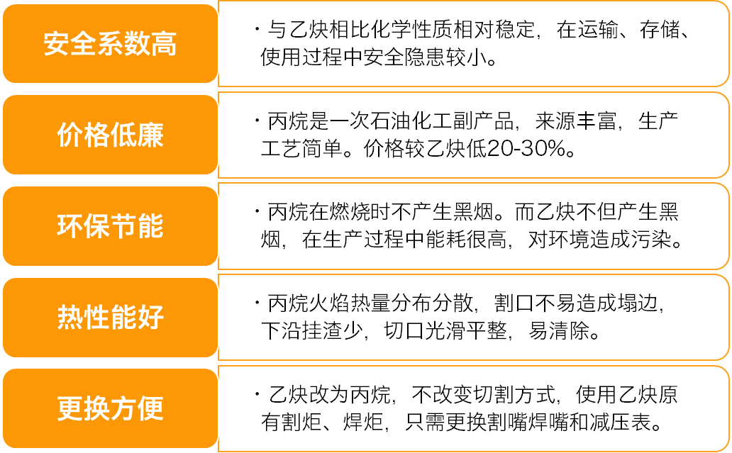 在切割焊接等工藝中,丙烷和乙炔都是常用的可燃?xì)怏w。然而在具體實(shí)踐中,丙烷因其安全、綠色、高效、性?xún)r(jià)比高等特點(diǎn),逐漸成為工業(yè)用戶(hù)的首選氣體,大有取代乙炔之勢(shì)。與乙炔等氣體相比,丙烷具有多種優(yōu)勢(shì):